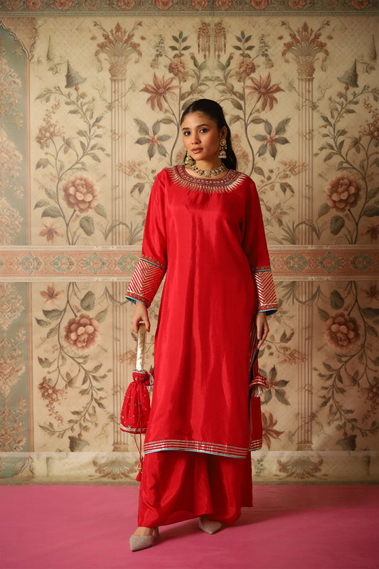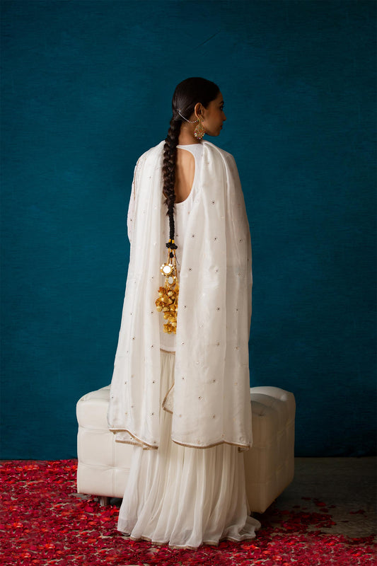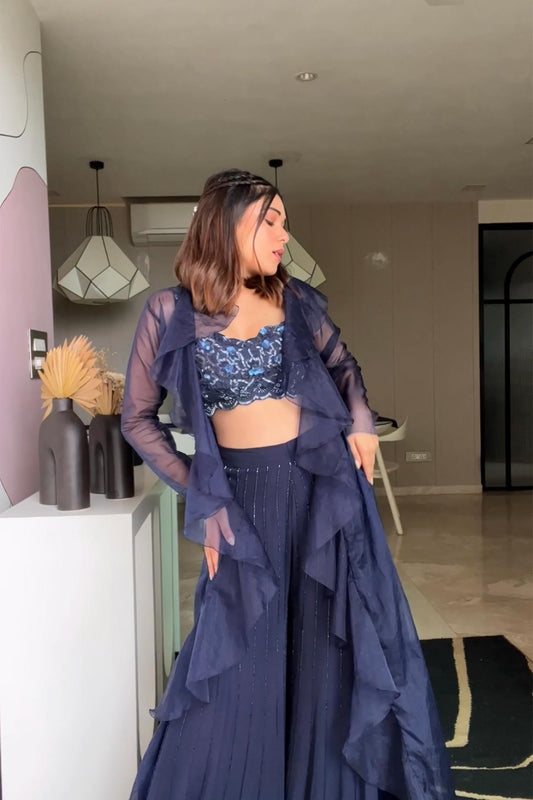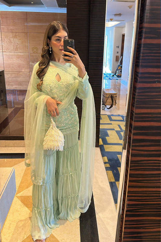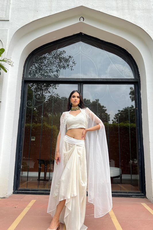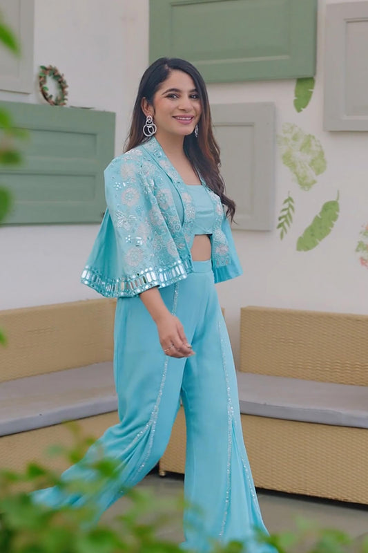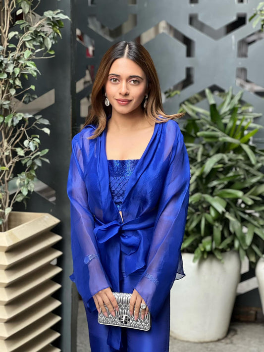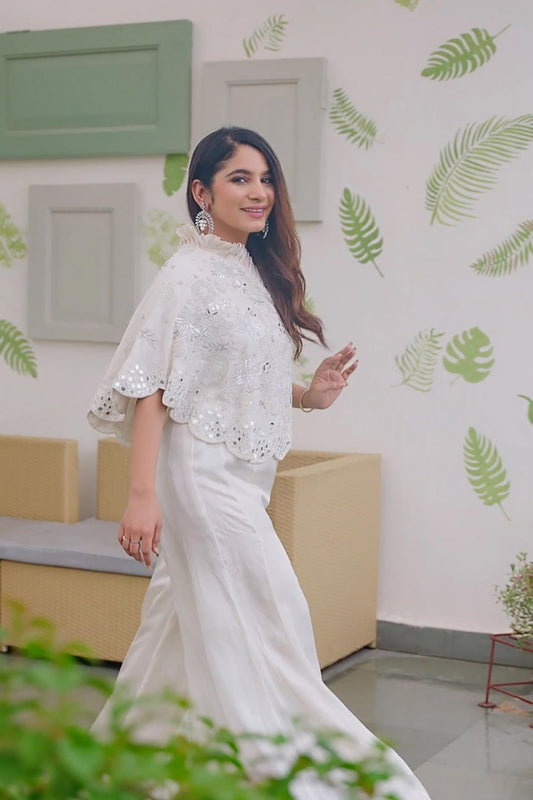 Effortless, contemporary & chic- a co-ord set comprising of a one shoulder cape hand embellised using sequins, mirror, zardozi & resham hand embroidery and a pair of flared palazzos to add glam to the outfit. Pair with potli bag for a glamourous look!