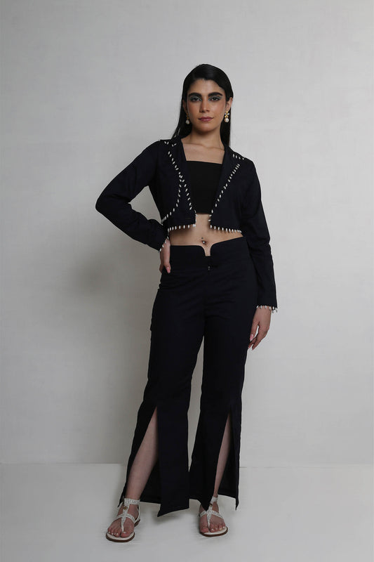 Alayna - Black Cropped Trench Jacket With Pearl Drops, Flared Pants With Front Open Slit Panel & Cropped Bustier