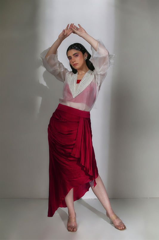 Ezra - Ivory Organza V-Neck Top With Pearl Hand-Embroidery on the Collar & Bows Paired with a Scarlet Red Draped Skirt