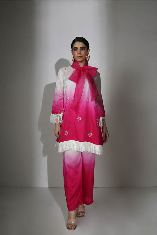 Aara - Ivory & Fuschia Pink Ombre Dyed Fringe Co-Ord With Flared Pants