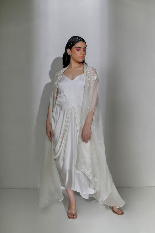 Zinia - Ivory Draped Cowl Dress and Organza Cape With Pearl Hand-Embroidery