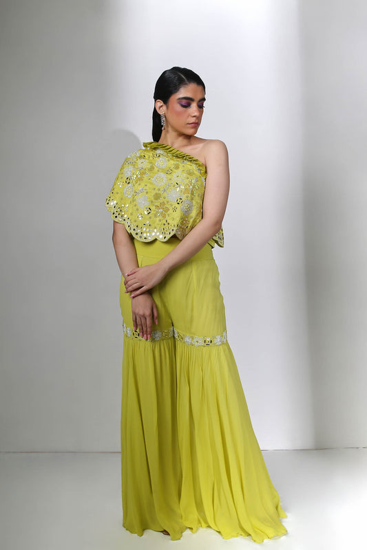 Sahiba Sunshine Yellow One Shoulder Cape and Flared Pants with Mirror Work