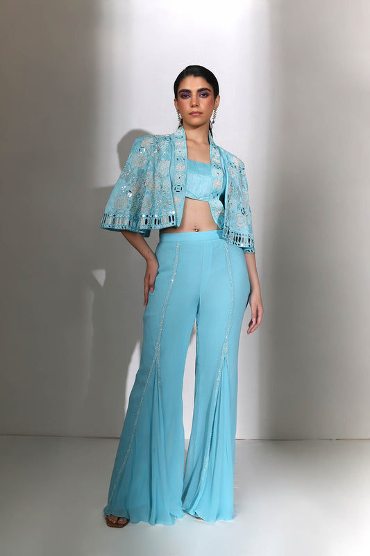 Inaya - Turquoise Mirror Work Blazer With Flared Cape Sleeves and Palazzos