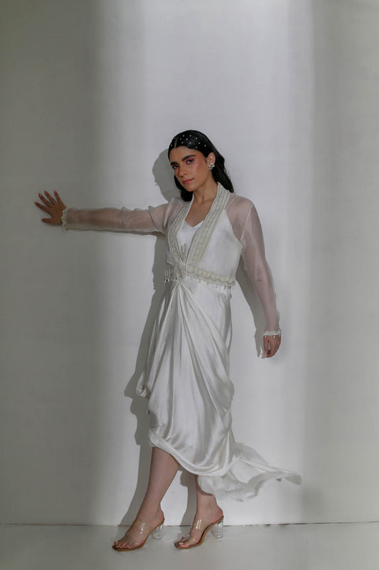 Aster - Ivory Draped Cowl Dress & Cropped Organza Jacket With Pearl Hand-Embroidery on the Collar