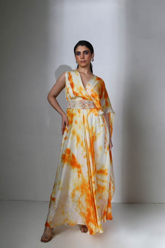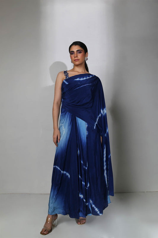 Tasha - Shades of Blue Tie Dye One Shoulder Draped Gown With Hand-Embroidered Stap