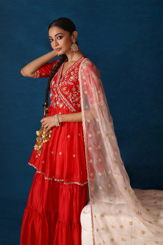 Mehr Red Cutwork Blouse, Ruffle Jacket & Layered Sharara