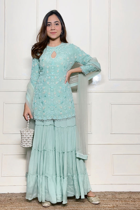 Esra - Sea Green Kurta With Pearl Work & Sharara